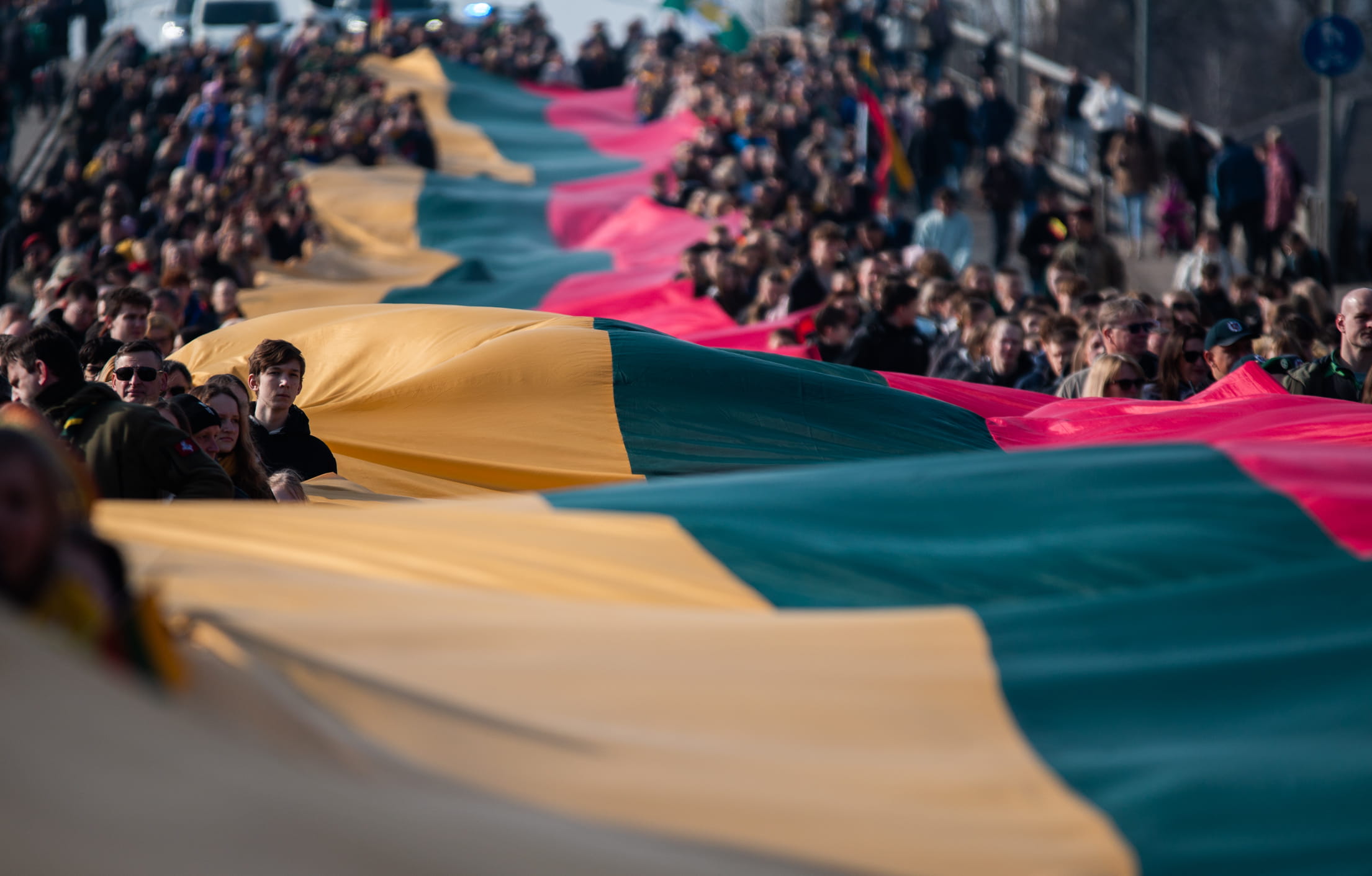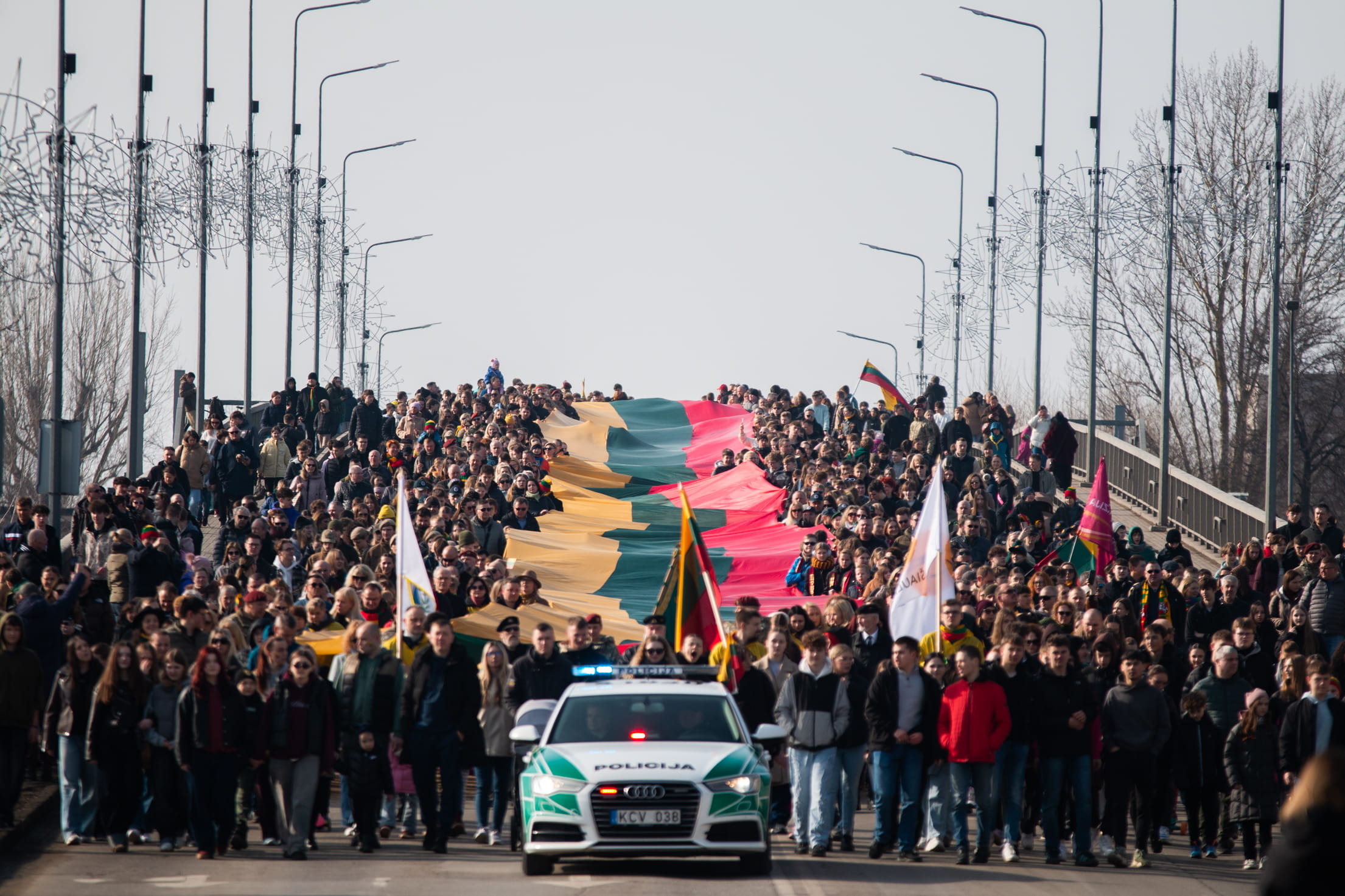 The morning of March 11 began with the tricolor march “Lithuania in Our Hearts,” organized by the 6th Territorial Unit of the Resurrection District of the National Defence Volunteer Forces and the Šiauliai Cultural Center, bringing together different spaces and people of the city. The procession stretching from Šiauliai Arena to Prisikėlimo Square became a living symbol of patriotism. A special part of the march was the participation of young people from Šiauliai – students from gymnasiums and progymnasiums who carried an impressive 300-meter-long Lithuanian State flag. The procession was accompanied by the Šiauliai Wind Orchestra (art director and conductor S. Vaičiulionis, conductor G. Brūzga), whose music added solemnity and an uplifting atmosphere to the march.