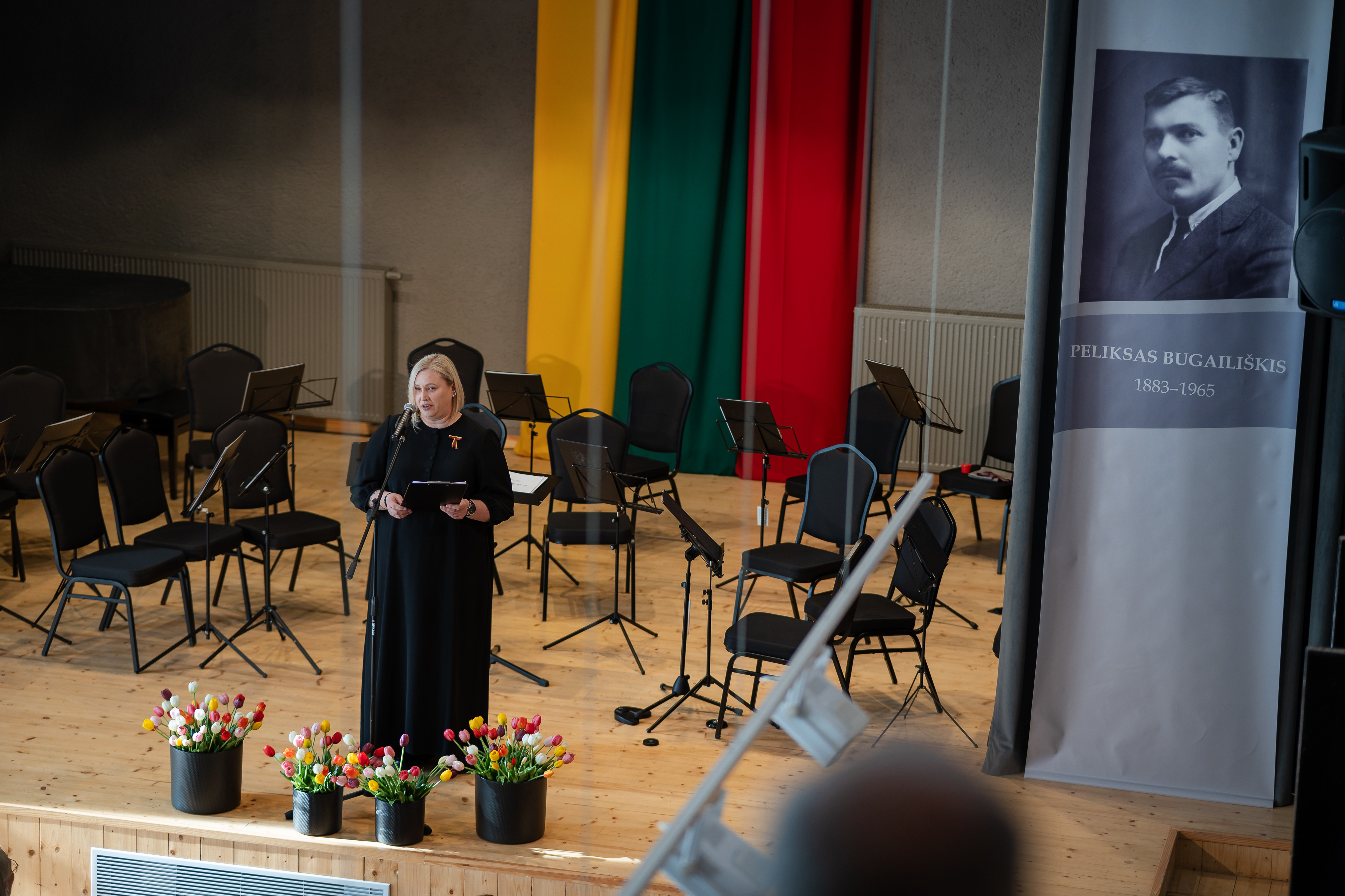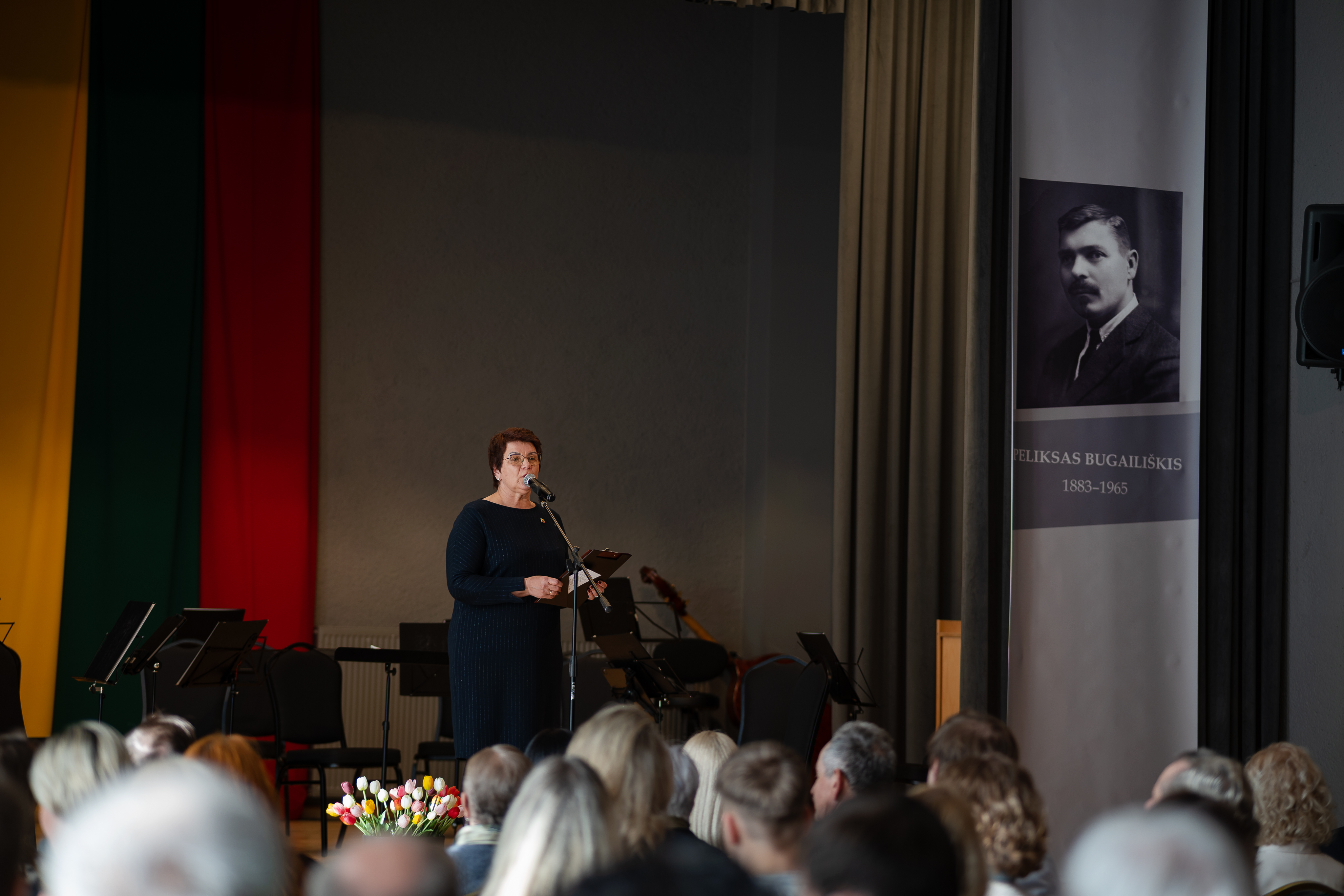At the beginning of the event, the audience was welcomed by the Director of the Šiauliai Cultural Center, Deimantė Bačiulė. She emphasized that the ideas promoted by P. Bugailiškis – care for cultural heritage, historical memory, and the strengthening of community – remain important today. “Today we gather not only to commemorate the freedom of the state but also to remember a person whose life and work were dedicated to Lithuania, its culture, history, and society. This is a personality whose activities left a deep mark in Šiauliai and continue to inspire us to protect and nurture the cultural memory of our region – Peliksas Bugailiškis. Therefore, today we invite you to look at this personality anew: to remember his work, give meaning to his legacy, and continue the cultural mission he began,” said Deimantė Bačiulė.