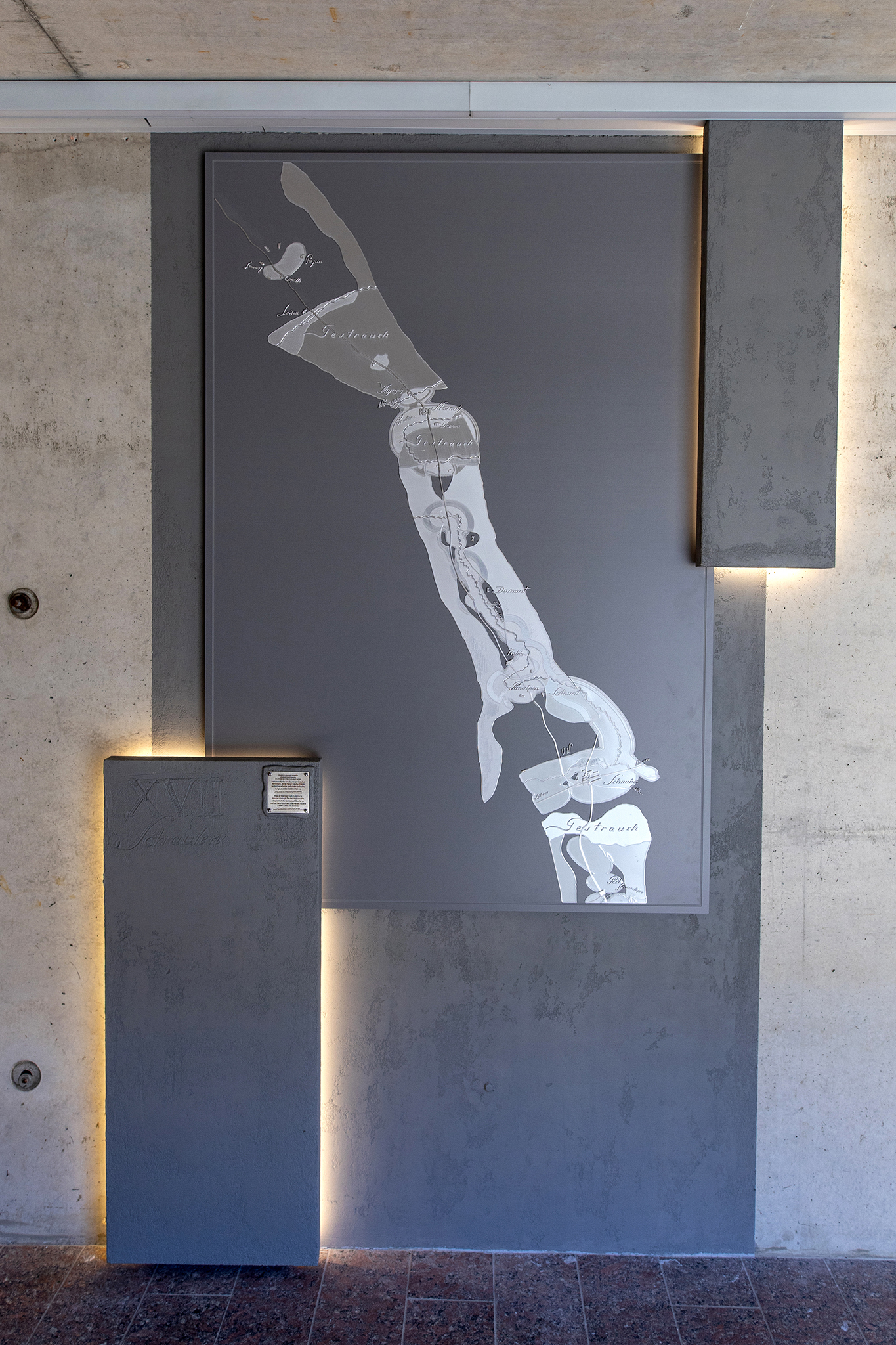 Prisikėlimo aikštės apžvalgos pastate kuriama ekspozicija iš esmės keičia įprastą erdvės suvokimą. Vietoje tradicinių stendų čia atsiranda į architektūrą integruoti reljefiniai istorijos įspaudai – miesto praeities fragmentai, tiesiogine prasme įspausti į betoną.